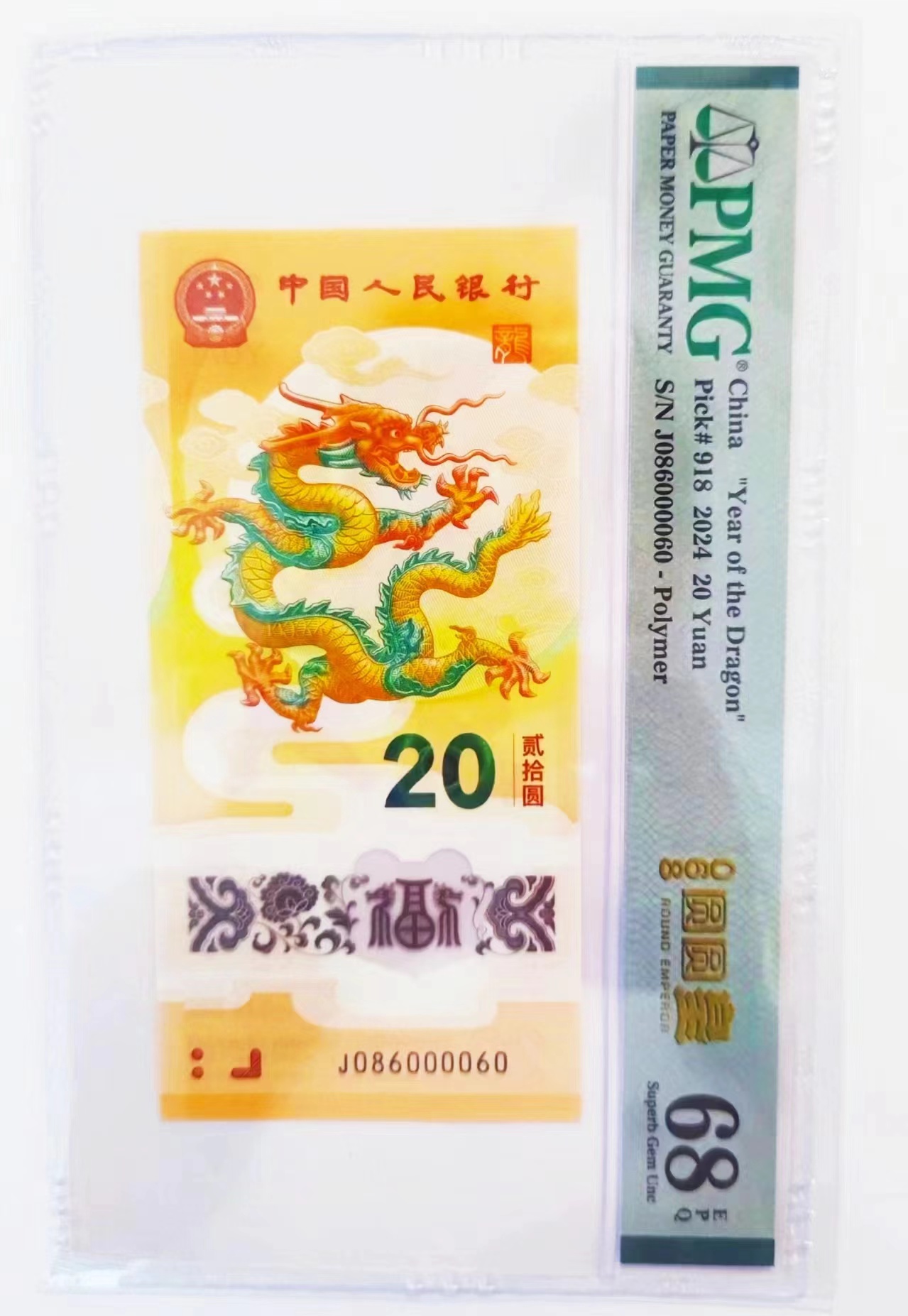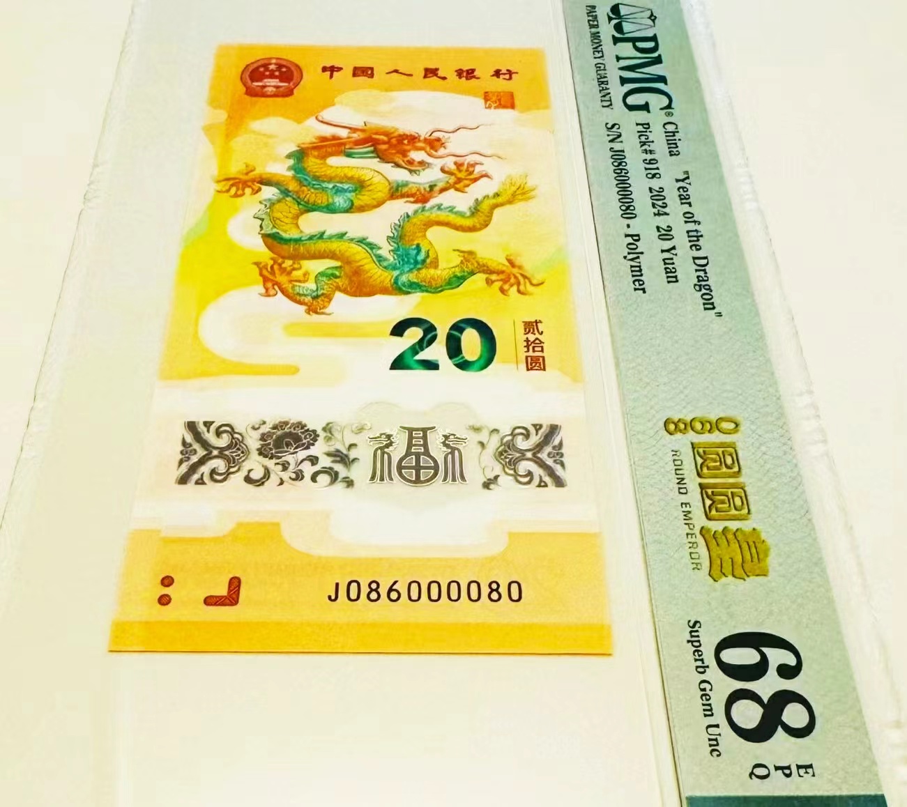 086国门号PMG68分纯086组合小龙钞2张,60号和80号一对: