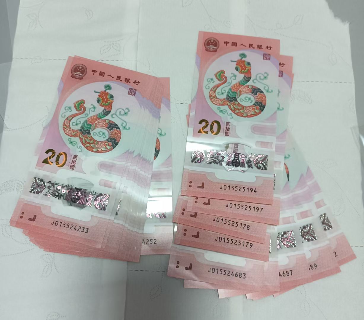 蛇年纪念钞,有组20张连号,全新品相,通走42元一张,33张1386元。