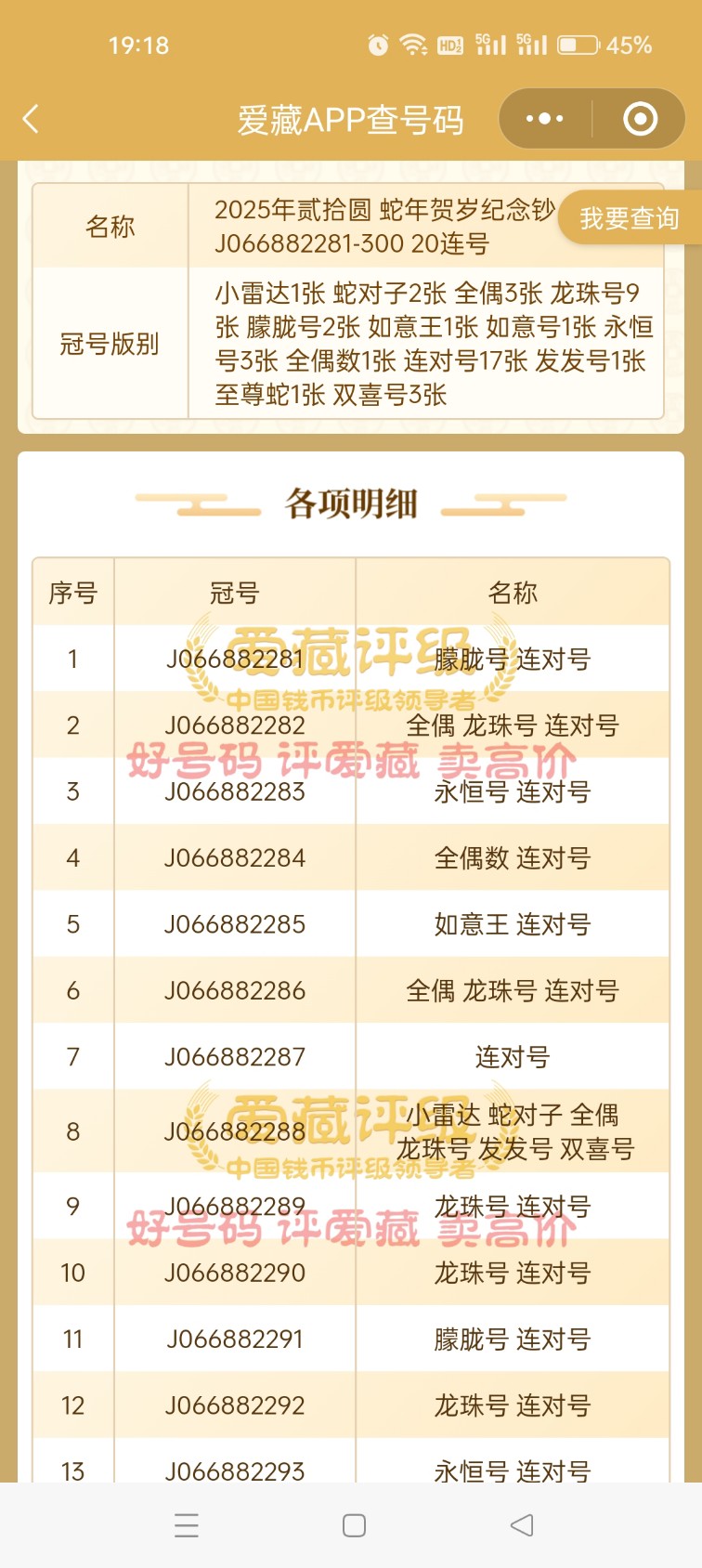 出售蛇钞全偶二十连(066882281-300),全偶、龙珠号都有,通走售价:4900,多网同售,电联确认!