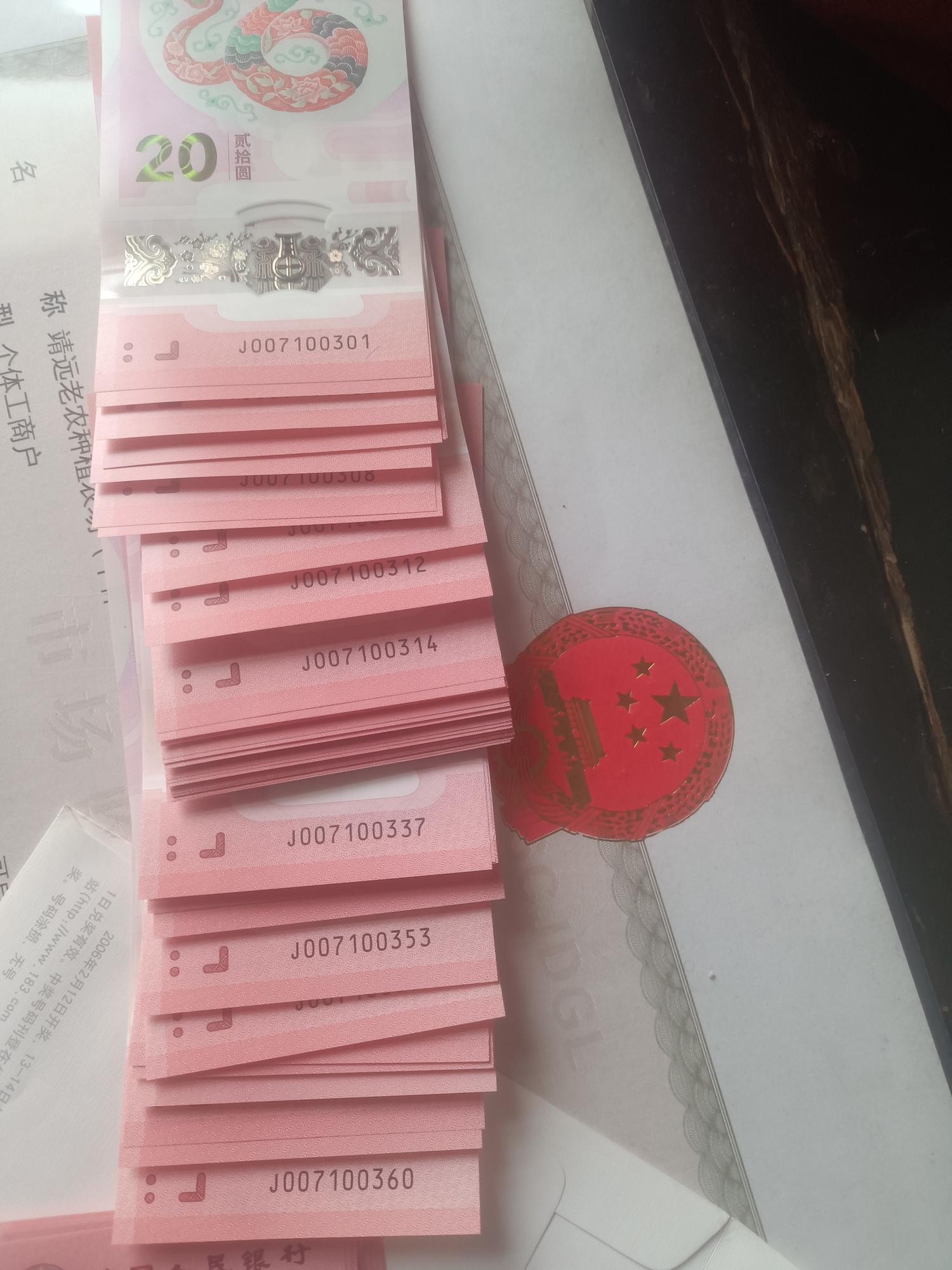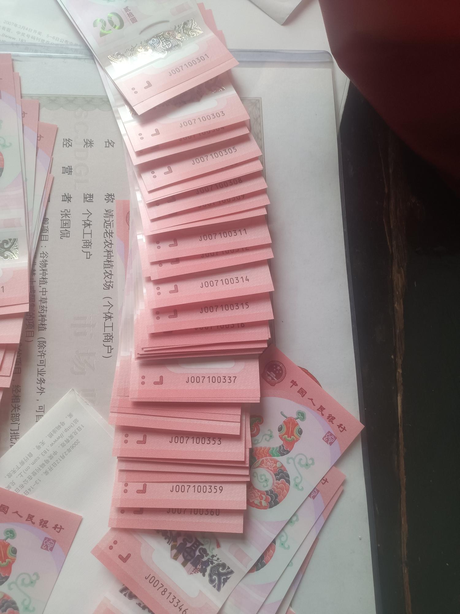 如图,出一点蛇钞,一个标六十,01---60含333豹子号,一个标十,另外还有20枚散钞,散钞有5枚含4,346.347.348.349.364还有355.356.358.359等好号!标60一枚按39出,标十和散钞按37出,先款,尽量一次出!包邮政挂号或普通快递!需顺丰运费到付!