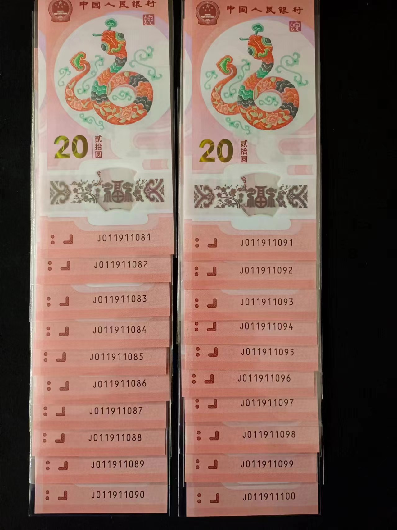 售 蛇钞J011911081标十 倒置号88标十 J011911091标十【019组合】倒置蛇三 20张连号 10张倒置号 售价8988元
