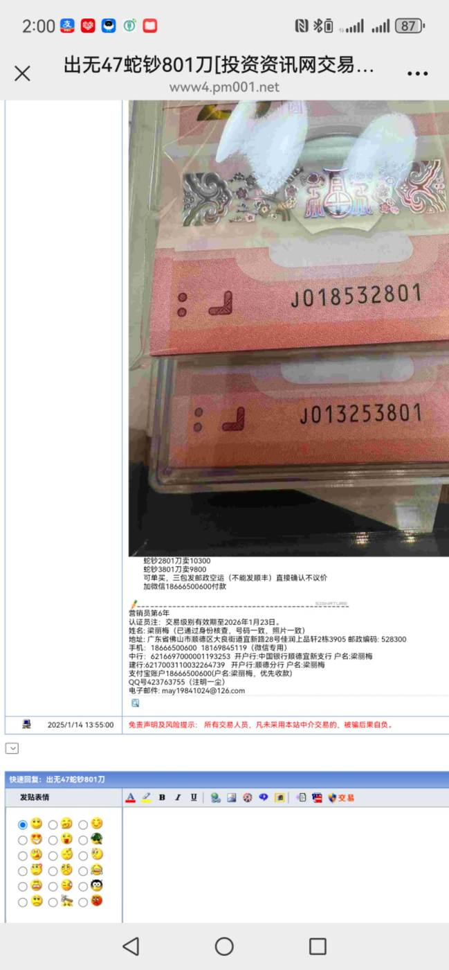 免责声明: 本站所有交易发帖内容,均是为了更好地服务和方便本站用户。本站不保证所有信息、文本、图形、评分、链接及其它项目的绝对准确性和完整性。凡未采用本站中介交易的,被骗后果自负。