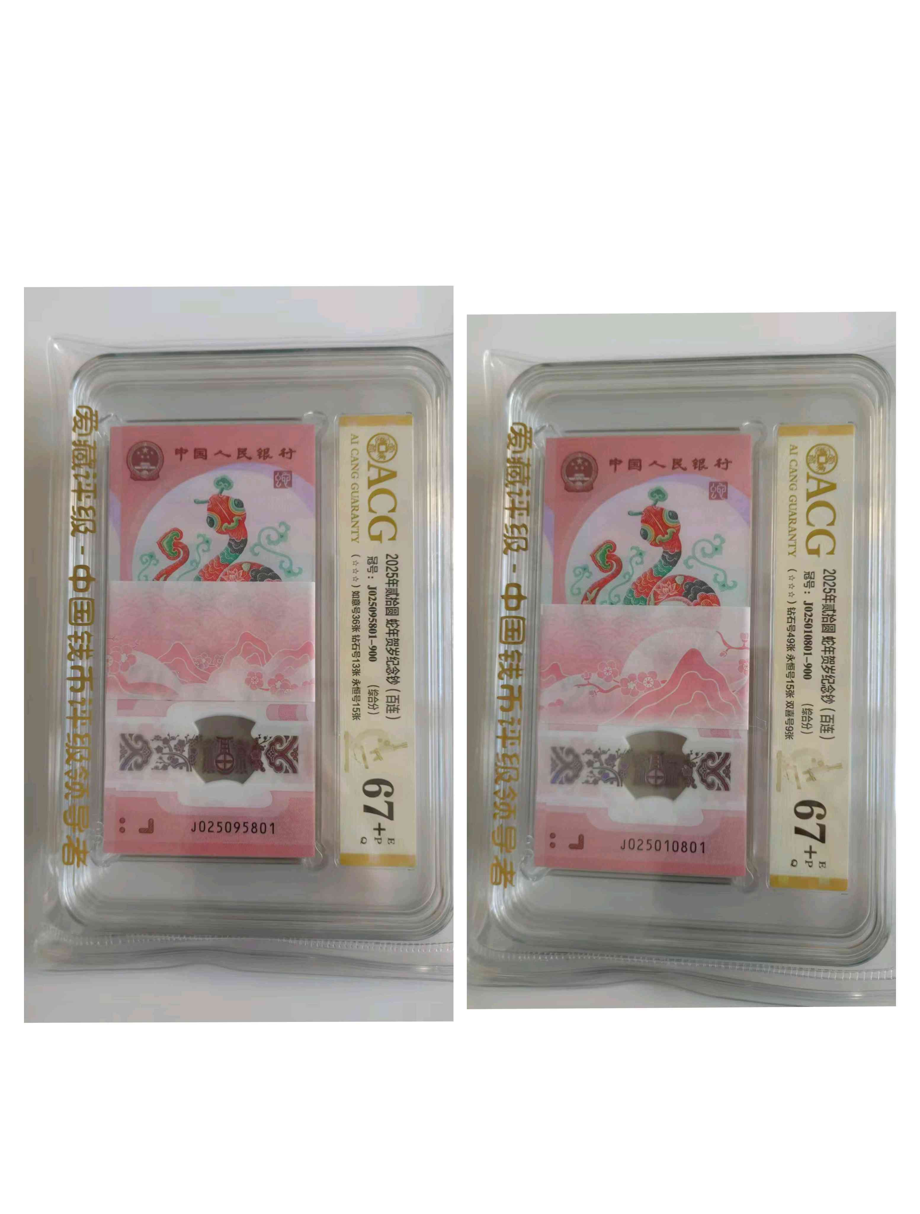 出蛇钞爱藏评级67分尾801 J025095801、J025010801标百带025标百 2万一刀任选包顺丰,电联确认