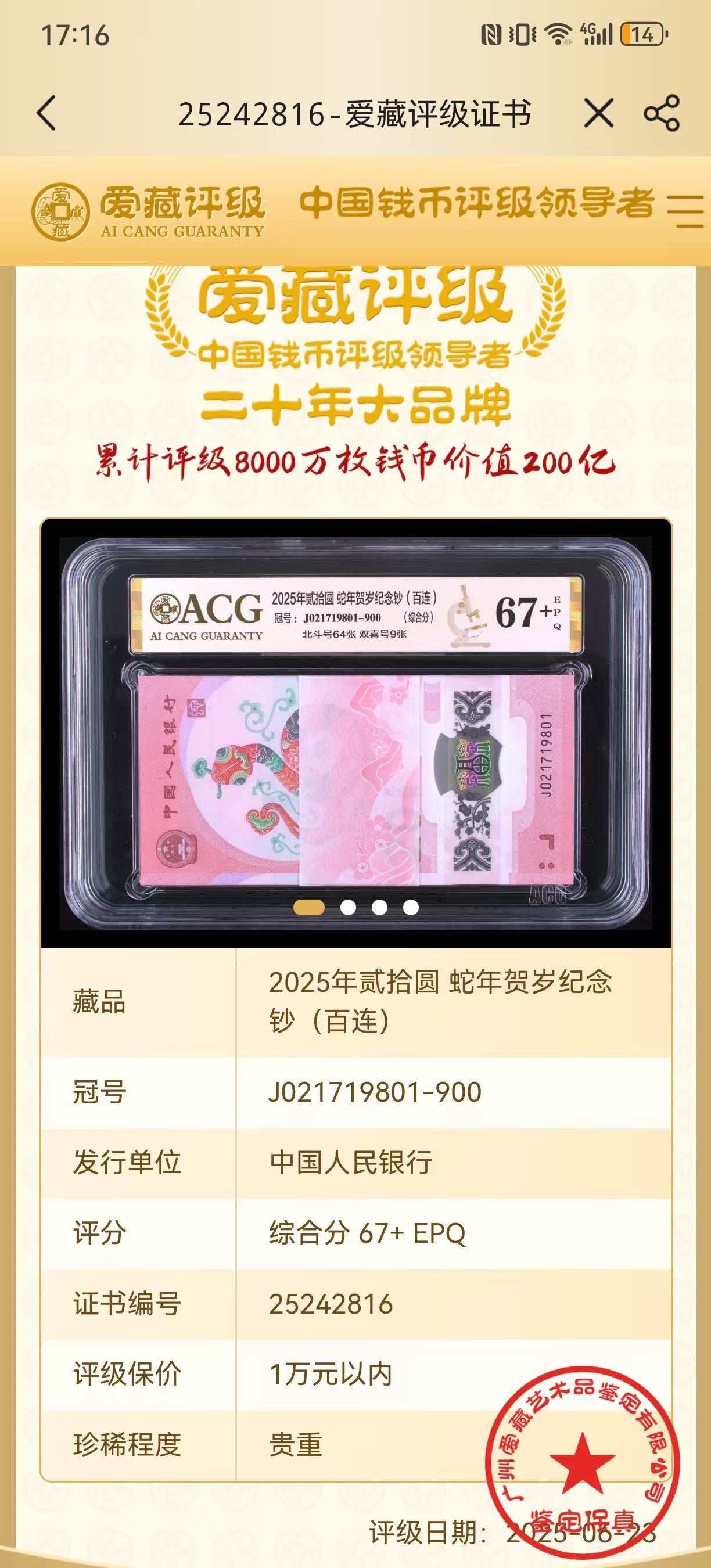 → 蛇钞无34标百801爱藏67+,号码021719801,龙蛇全同号