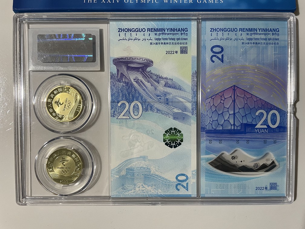 年冬奥钞和冬奥币礼品册,亚历克盒包装,带礼品袋,内含冬奥钞一对,尾